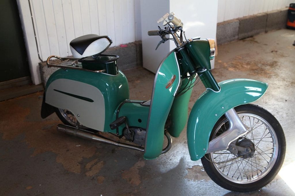 Bilsamlingen til Westlie er ganske omfattende. Foruten den grønne 56-modellen stiftet vi bekjentskap med en vi en sort 1953- modell også, begge like pedantisk restaurert. En romslig garasje i bakgrunnen vekket oppmerksomhet. Garasjen inneholdt alt man kan ønske av verktøy til restaurering, samt en Honda 350 fra 1971. Det viste seg at Leif-Egil hadde enda en godbit på lur, nemlig en Monark 1957-modell. Mopedinteressen er vel ivaretatt.