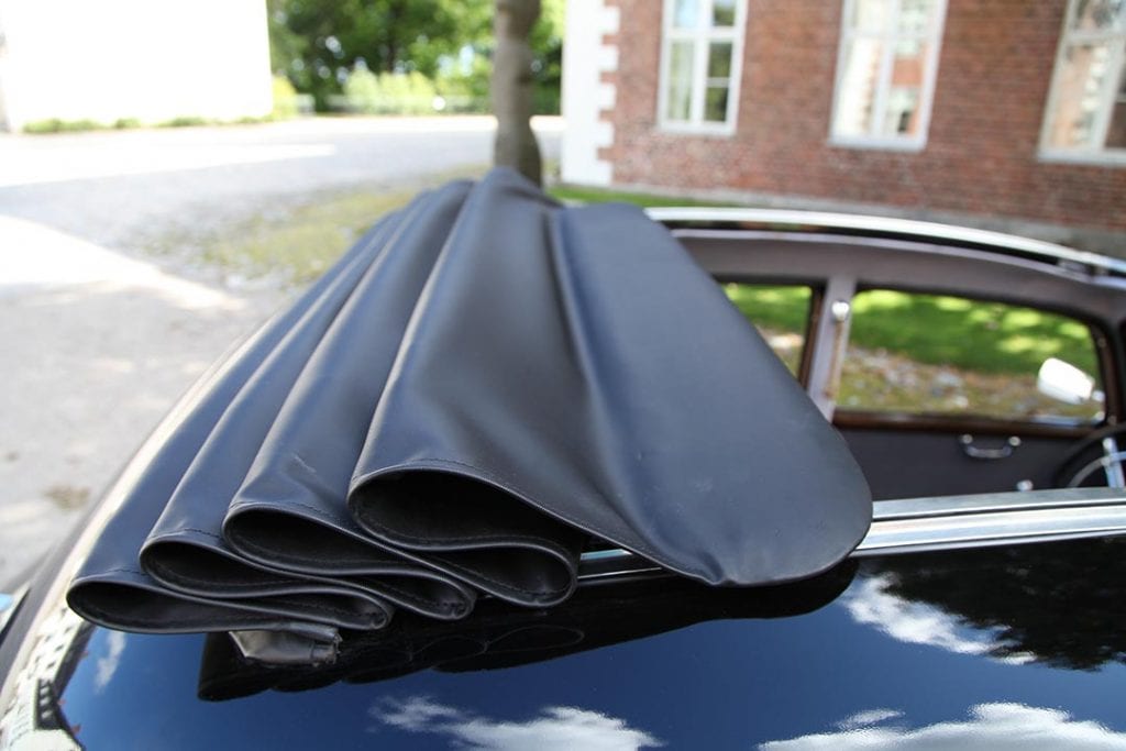• Siden interiøret ikke reproduseres kom jeg over en rull med originalt vevd mønster til interiøret og laget nye dørpanel selv, men trekking av seter ble satt bort til en salmaker med restene fra samme rull på den sorte 53-modellen.