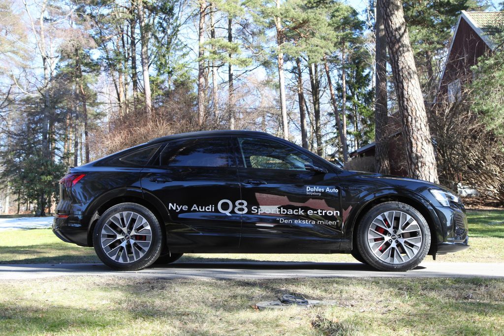 Vår Audi Q8 Sportback e-tron 55 oppfører seg annerledes enn vi kan huske fra tidligere. Bilen forserer svingene nærmest uten å krenge og man føler underlaget opp i bilen, slik at man får en følelse av ujevn asfalt igjennom understellet og samme følelse i ratt.