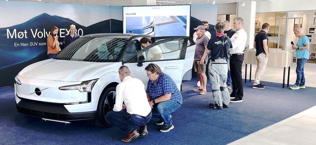 Derfor var det også Volvoansatte fra andre Bilbutikk1-forhandlere til stede, og besøkende fikk god hjelp de åtte timene bilen kunne ses på i Fredrikstad. For her var det se men ikke røre, foreløpig. Volvo EX30 kommer fysisk til landet på nyåret en gang, men allerede nå kan de mest interesserte bestille på nett.