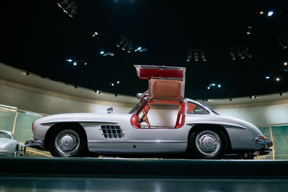 På Mercedes-Benz museet i Stuttgart i Tyskland står en sølvfarget Mercedes-Benz 300 SL Coupé med rødt interiør utstilt, der den tiltrekker seg mye oppmerksomhet fra de besøkende.
