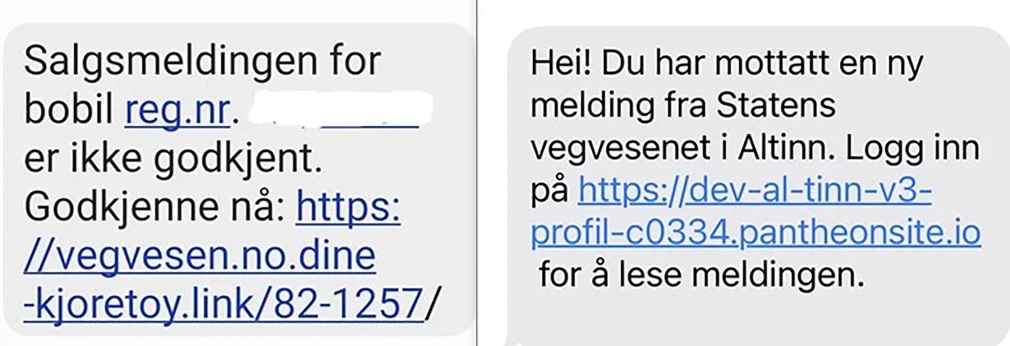 Hovedbilde: To eksempler på SMiShing (SMS-svindel). Illustrasjon: Statens vegvesen