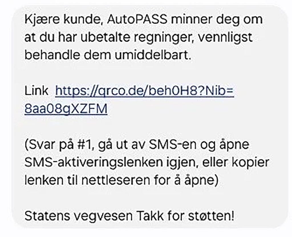 Statens vegvesen advarer selv i en pressemelding om de pågående svindelforsøkene. En SMS-avsender ber om penger for utestående AutoPASS-fakturaer.